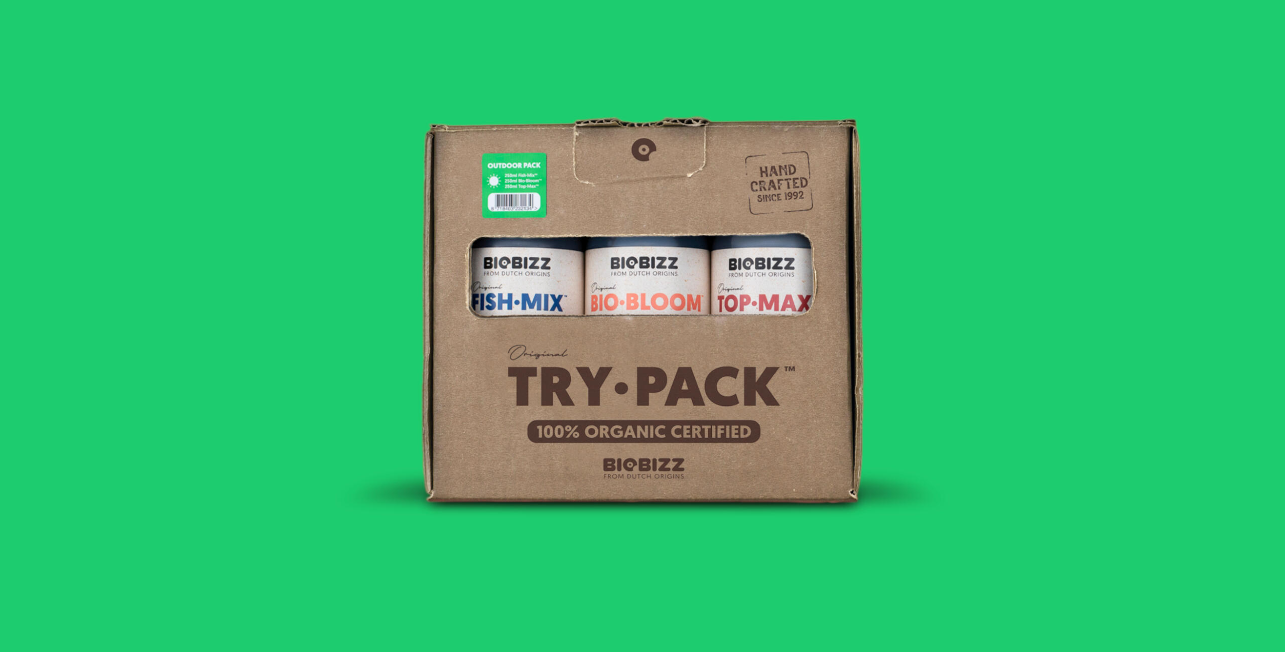 သင့်ဒေသရှိ ရာသီဥတုသည် သင့်လျော်ပြီး အပြင်ဘက်တွင် စိုက်ပျိုးခြင်းများပြုလုပ်ပါက Biobizz ကိုအသုံးပြုခြင်းသည် သင့်ဘဝအတွက် ပိုမိုလွယ်ကူစေပါစေ။ ကျွန်ုပ်တို့၏ Try·Pack မိသားစု၏ အဖွဲ့ဝင်လေးဦးထဲမှ တစ်ဦးဖြစ်သော Biobizz Try·Pack Outdoor ကို စမ်းသပ်သုံးကြည့်သင့်ပါသည်။ကိုင်တွယ်ရလွယ်ကူစေရန် ဒီဇိုင်းထုတ်ထားပြီး သင်၏သီးနှံကို အမြင့်ဆုံးနှင့် ကုန်ကျစရိတ်လျှော့ချရန် အခြား Biobizz ထုတ်ကုန်များ သို့မဟုတ် Try·Packs များနှင့်လည်း ပေါင်းစပ်နိုင်သည်။ ဤပေါင်းစပ်မှုသည် အပင် ၁-၄ ပင်အတွက် အခြေခံ အာဟာရများကို ထောက်ပံ့ပေးသည်။